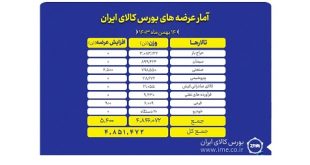 تالارهای بورس کالای ایران روز یکشنبه ۱۴ بهمنماه میزبان عرضه ۴ میلیون و ۸۵۱ هزار و ۴۷۲ تن انواع محصول است.