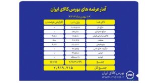 تالارهای بورس کالای ایران (چهارشنبه ۱۰ بهمن ماه) میزبان عرضه ۲ میلیون و ۹۱۹ هزار و ۷۱۴ تن انواع کالا و محصول است.