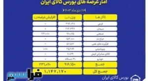تالارهای بورس کالای ایران در روز دوشنبه ۱۷ دی ماه میزبان عرضه یک میلیون ۱۴۷ هزار و ۱۷۰ تن انواع کالا و محصول است.