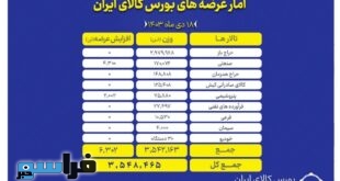 تالارهای بورس کالای ایران در روز سهشنبه ۱۸ دیماه میزبان عرضه ۳ میلیون و ۵۴۸ هزار و ۴۶۴ تن انواع کالا و محصول است.
