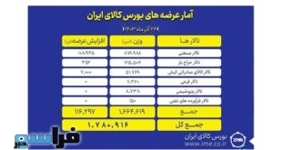 تالارهای بورس کالای ایران در نخستین روز هفته (شنبه ۲۴ آذرماه) میزبان عرضه یک میلیون و ۷۸۰ هزار و ۹۱۵ تن انواع کالا و محصول است.