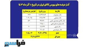 تالارهای بورس کالای ایران در نخستین روز هفته (شنبه ۱۰ آذر ماه) میزبان عرضه ۳ میلیون و ۷۰۵ هزار و ۳۳۲ تن انواع کالا و محصول است.