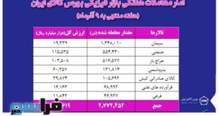 آمار معاملات بازار فیزیکی بورس کالای ایران نشان می دهد در هفته منتهی به ۹ آذر ماه بالغ بر ۲ میلیون و ۶۱۹ هزار تن انواع کالا و محصول به ارزش بیش از ۳۱ هزار میلیارد تومان معامله شد.