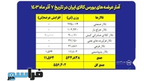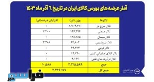 تالارهای بورس کالای ایران در روز سهشنبه ۶ آذر ماه میزبان عرضه ۳ میلیون و ۳۲۶ هزار و ۱۷۶ تن انواع کالا و محصول است.