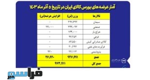 تالارهای بورس کالای ایران در روز دوشنبه ۵ آذر ماه میزبان عرضه ۹۷۳ هزار و ۹۱۱ تن انواع کالا و محصول است.
