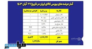 تالارهای بورس کالای ایران روز یکشنبه ۲۷ آبان ماه میزبان عرضه یک میلیون و ۱۲۲ هزار و ۹۸۹ تن محصول است که بیشترین عرضه های امروز در تالار سیمان رقم می خورد