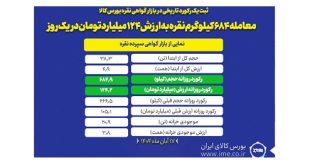 بازار گواهی سپرده نقره در بورس کالای ایران روز گذشته شاهد ثبت رکوردی تاریخی در معاملات روزانه بود.روز شنبه ۱۷ آبانماه مجموعاً ۶۸۴.۹ کیلوگرم نقره در قالب گواهی سپرده کالایی دادوستد شد که ارزشی معادل ۱۲۴.۲ میلیارد تومان را رقم زد.