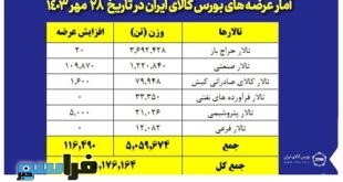 تالارهای بورس کالای ایران در نخستین روز هفته (شنبه ۲۸ مهر ماه) میزبان عرضه ۵ میلیون و ۱۷۶ هزار و ۱۶۴ تن انواع کالا و محصول هستند.