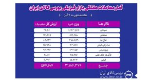تالار صادراتی بورس کالای ایران در هفته منتهی به ۹ آبان ماه میزبان معامله ۴۲۱هزار و ۵۷۱تن انواع کالا و محصول بود.
