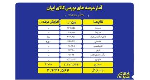 تالارهای بورس کالای ایران امروز یکشنبه ۳۰ آذرماه میزبان عرضه ۲ میلیون و ۴۳۶ هزار و ۵۶۴ تن انواع محصول است.