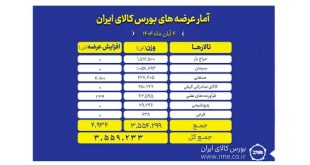 تالارهای بورس کالای ایران امروز یکشنبه ۴ آبان ماه میزبان عرضه ۳ میلیون و ۵۵۹ هزار و ۲۳۳ تن محصول است.