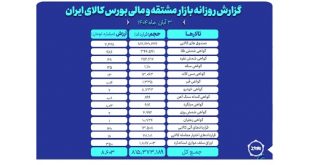 روز گذشته در بازار مشتقه و مالی بورس کالای ایران ۸۱۵ میلیون و ۳۷۳ هزار و ۱۸۹ قرارداد به ارزش ۸ هزار و ۶۰۳ میلیارد تومان منعقد شد.