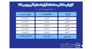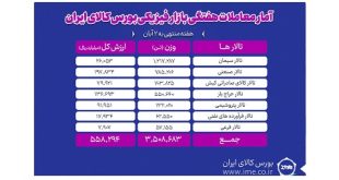 تالار صادراتی بورس کالای ایران در هفته منتهی به ۲ آبان ماه میزبان معامله ۷۰۳ هزار و ۸۲۵ تن انواع کالا و محصول بود.