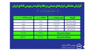 بررسی عملکرد ابزارهای مبتنی بر طلا و نقره در بورس کالای ایران نشان میدهد که در هفته گذشته بیش از ۲.۳ تن شمش نقره و نزدیک به ۲۱۳ کیلوگرم شمش طلا در بازار گواهی سپرده و آتی معامله شد.