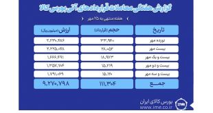 بررسی روند معاملات قراردادهای آتی بورس کالای ایران درهفته منتهی به ۲۵ مهر نشان می دهد که در هفته گذشته ارزش معاملات بازار آتی به بیش از ۹۲۷ میلیارد تومان رسید.