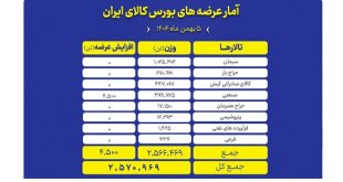 تالارهای بورس کالای ایران امروز یکشنبه ۵ بهمن ماه میزبان عرضه ۲ میلیون و ۵۷۰ هزار و ۹۶۹ تن انواع محصول است.