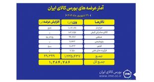 تالارهای بورس کالای ایران در در اولین روز هفته (شنبه ۲۹ شهریور ماه) میزبان عرضه یک میلیون و ۲۸۴ هزار و ۷۸۶ تن انواع محصول است. بیشترین حجم عرضه امروز متعلق به تالار محصولات حراج باز است به طوری که در این تالار بیش از یک میلیون تن محصول روی تابلو می رود.