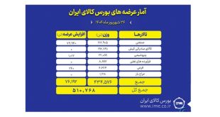 تالارهای بورس کالای ایران امروز دوشنبه ۲۴ شهریور ماه میزبان عرضه ۵۱۰ هزار و ۷۶۸ تن انواع محصول است. بیشترین عرضه امروز متعلق به تالار صنعتی است.