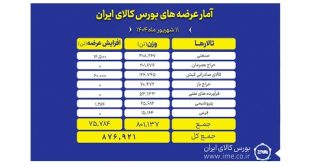 تالارهای بورس کالای ایران در روز سهشنبه ۱۱ شهریور ماه میزبان عرضه ۸۷۶ هزار و ۹۲۱ تن انواع محصول است. بیشترین حجم عرضه امروز متعلق به تالار صنعتی و از نوع آهن اسفنجی است.