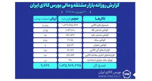 در روز ۹ شهریور ماه در بازار مشتقه و مالی بورس کالای ایران در مجموع بیش از یک میلیارد و ۳۵ میلیون و ۹۶۹ هزار قرارداد به ارزش ۹ هزار و ۶۶۹ میلیارد تومان منعقد شد.