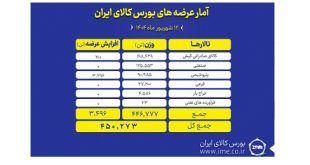 تالارهای بورس کالای ایران سه شنبه ۱۱ شهریور ماه میزبان معامله ۶۹۶ هزار و ۹۳۱ تن انواع محصول بود و تالار صنعتی با معامله ۳۰۰ هزار تن محصول بیشترین میزان معامله را به خود اختصاص داد.