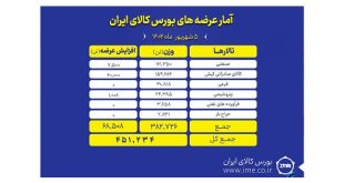 تالارهای بورس کالای ایران امروز چهارشنبه ۵ شهریور ماه میزبان عرضه ۴۵۱ هزار و ۲۳۴ تن انواع محصول است. بیشترین عرضه امروز در تالار صادراتی است.