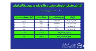بررسی عملکرد ابزارهای مبتنی بر طلا و نقره در بورس کالای ایران نشان میدهد که در هفته گذشته در مجموع ۵۷۶.۹ کیلوگرم شمش نقره و ۵۵۸.۱ کیلوگرم شمش طلا در بازار گواهی سپرده و آتی معامله شد.
