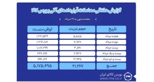 بررسی روند معاملات قراردادهای آتی بورس کالای ایران درهفته منتهی به ۲۴ مرداد نشان می دهد که در هفته گذشته ارزش معاملات بازار آتی به بیش از ۵۱۷ میلیارد تومان رسید.
