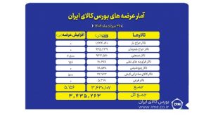 تالارهای بورس کالای ایران روز یکشنبه ۲۶ مرداد ماه میزبان عرضه ۳ میلیون و ۴۳۵ هزار و ۲۶۳ تن انواع محصول است و به ترتیب تالار حراج باز، تالار صنعتی و تالار حراج همزمان بیشترین میزان عرضه ها را به خود اختصاص داده اند.